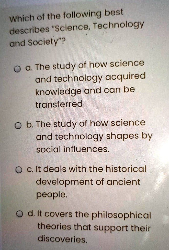 Solved Which Of The Following Best Describes Science Technology And Society A The Study Of How Science And Technology Acquired Knowledge And Can Be Transferred B The Study Of How Science And Technology